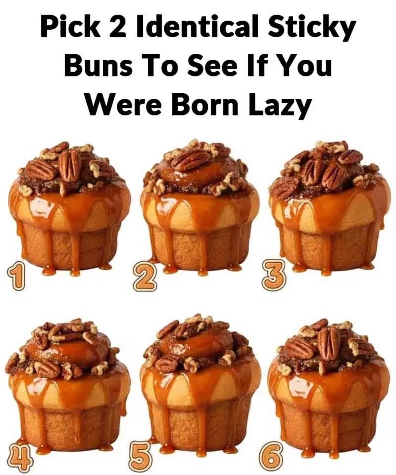 The simplest difficulties that spark conversation on the internet might occasionally surprise us. Six sweet buns dripping with caramel and topped with pecans make up today’s puzzle, which simultaneously looks delectable and challenging. The assignment? Select the two sticky buns that are the same.