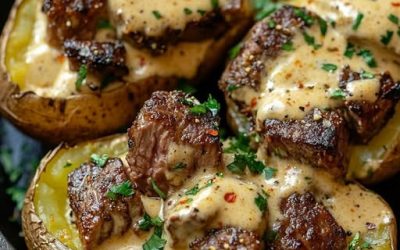 Steak-Stuffed Baked Potatoes with Creamy Parmesan Sauce