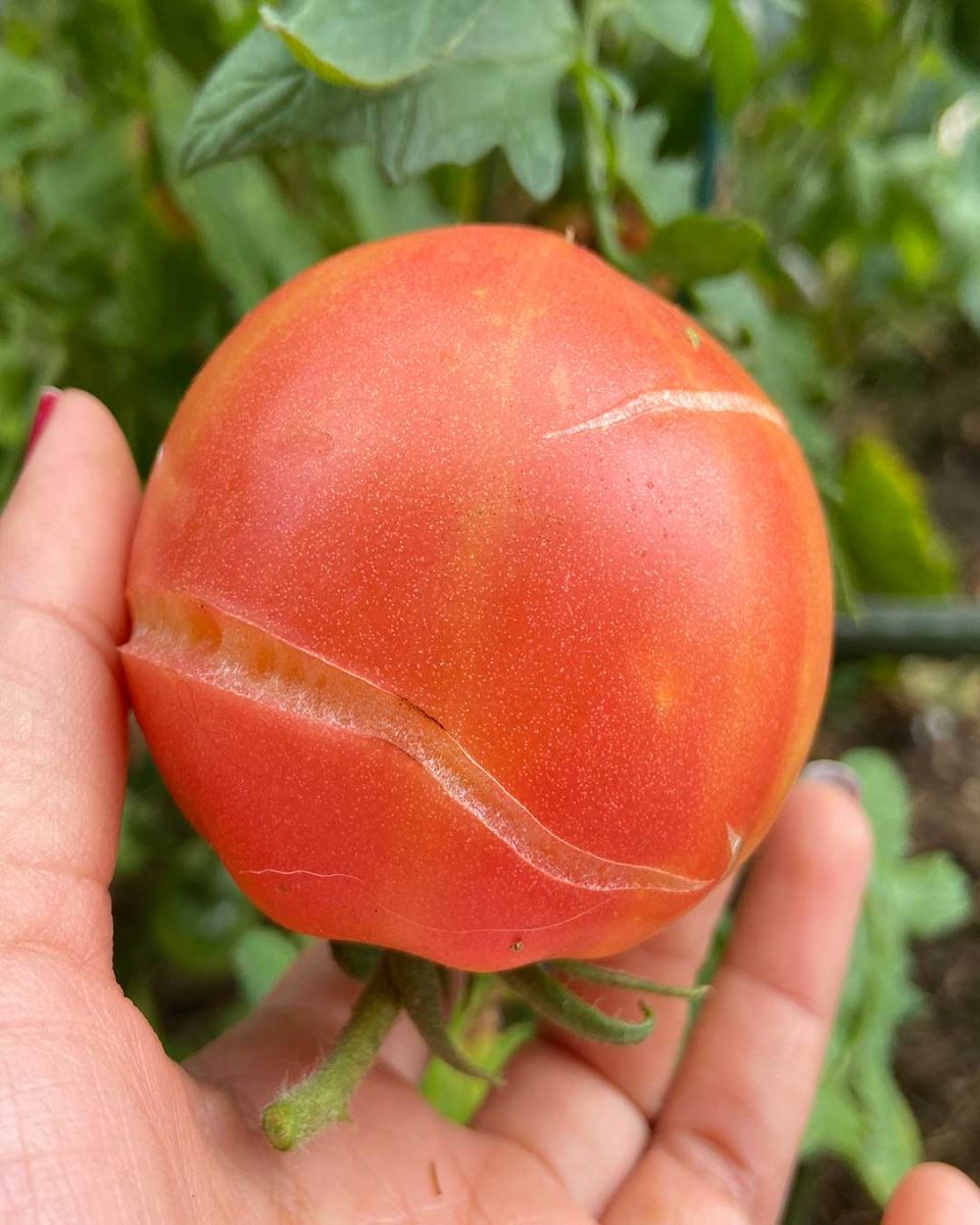 Tomatoes can experience rapid growth spurts during periods of favorable weather conditions, such as warm temperatures and ample sunlight. During these spurts, the fruit may grow faster than the skin can expand, leading to splitting. This is particularly common in young tomatoes that are still developing.
