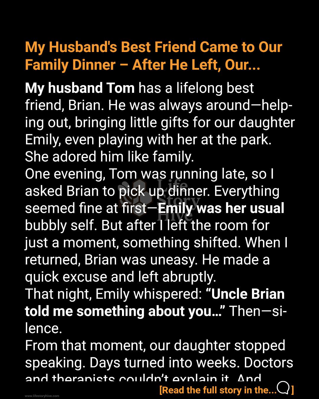 When my husband’s best friend, Brian, came over for a casual family dinner, I never imagined it would change our lives forever. But after that night, our daughter stopped speaking, and as the silence stretched on, we uncovered a devastating betrayal that shattered her innocence.