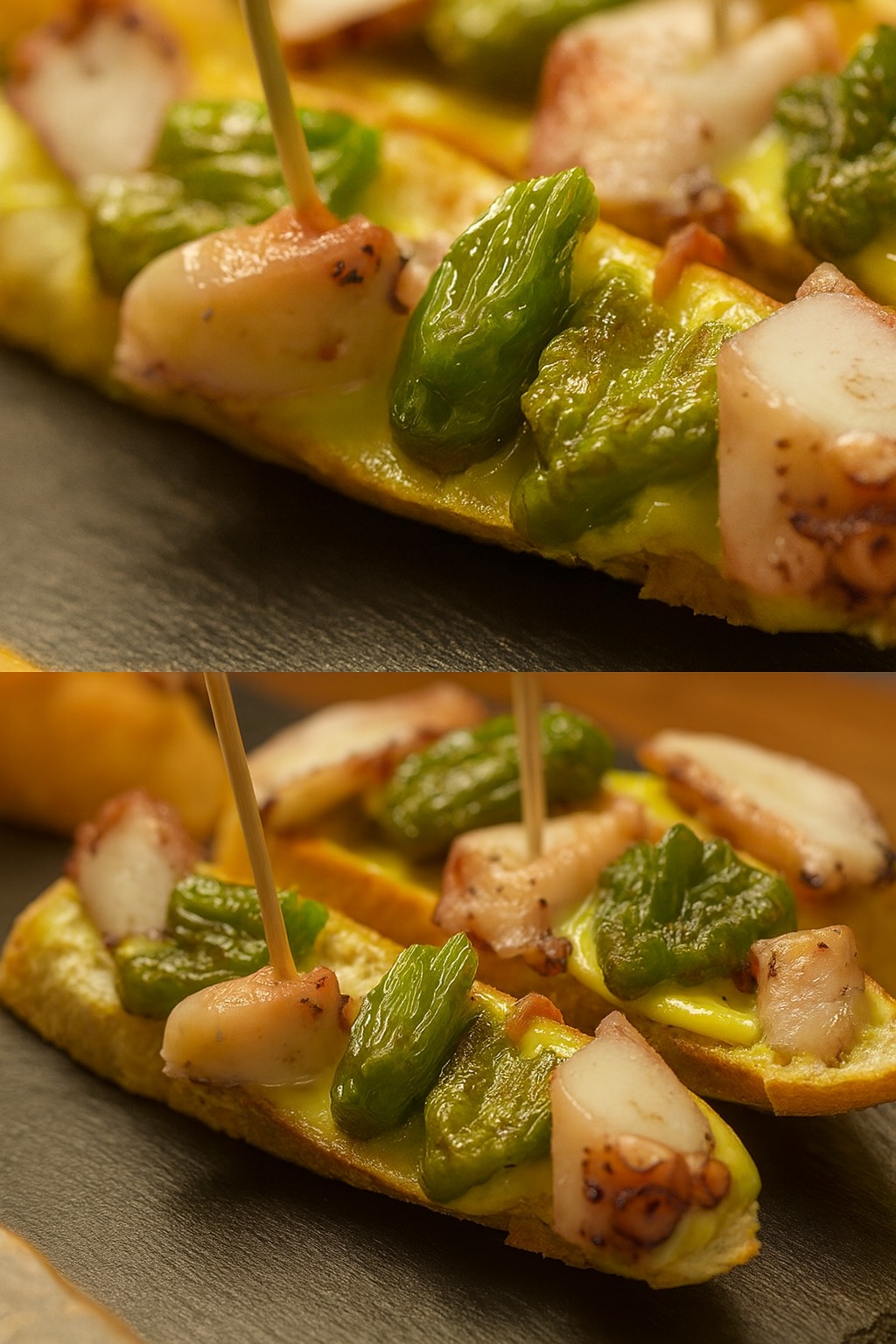 A simple, delicious, and refined Mediterranean appetizer. With tender octopus, melting peppers, and a touch of mayonnaise on crusty bread, these toasts will be a hit as an aperitif or starter.
